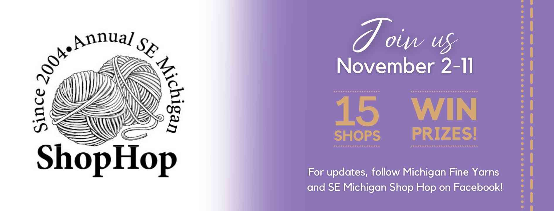 Enjoy all the fibers arts have to offer this fall with the annual Southeast Michigan Shop Hop! With 15 participating shops and tons of great prizes, this is an event you won't want to miss!