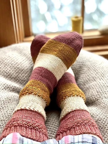 This thoughtfully designed pattern eliminates common sock stress points, there are no heel flaps, no short rows, and no turning, making it an approachable and enjoyable way to learn sock construction. You’ll focus on understanding the structure of a sock while gaining hands-on experience with techniques that feel manageable and intuitive.