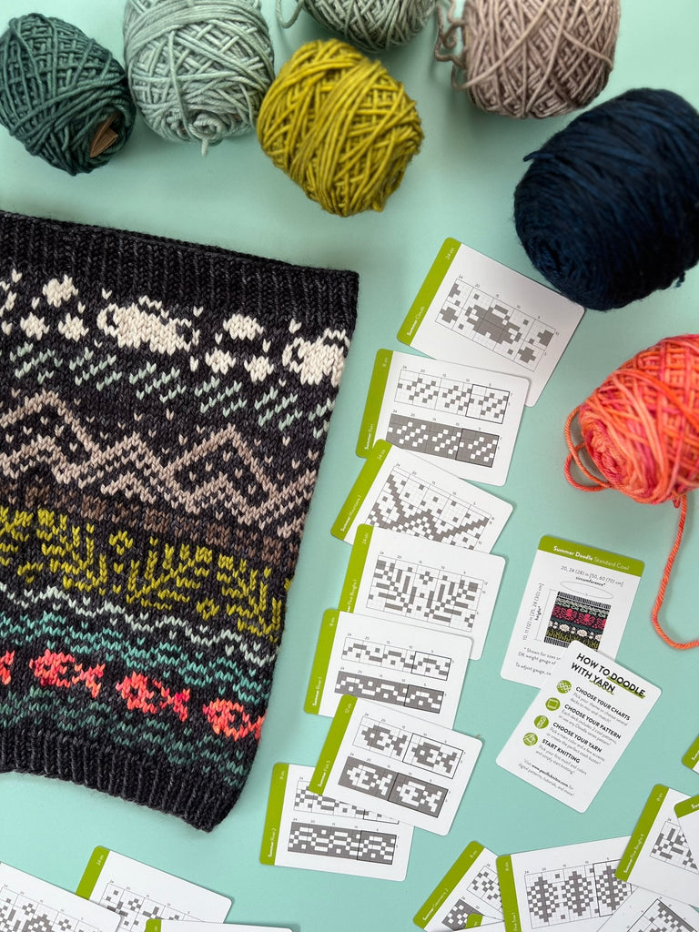 The Summer Doodle Card Deck is a portable, mix-and-match colorwork stitch dictionary inspired by long summer days spent along the Pacific coast and hiking through mountain landscapes. Designed to spark creativity and exploration, this deck brings the feeling of summer travel and the outdoors into your knitting.
